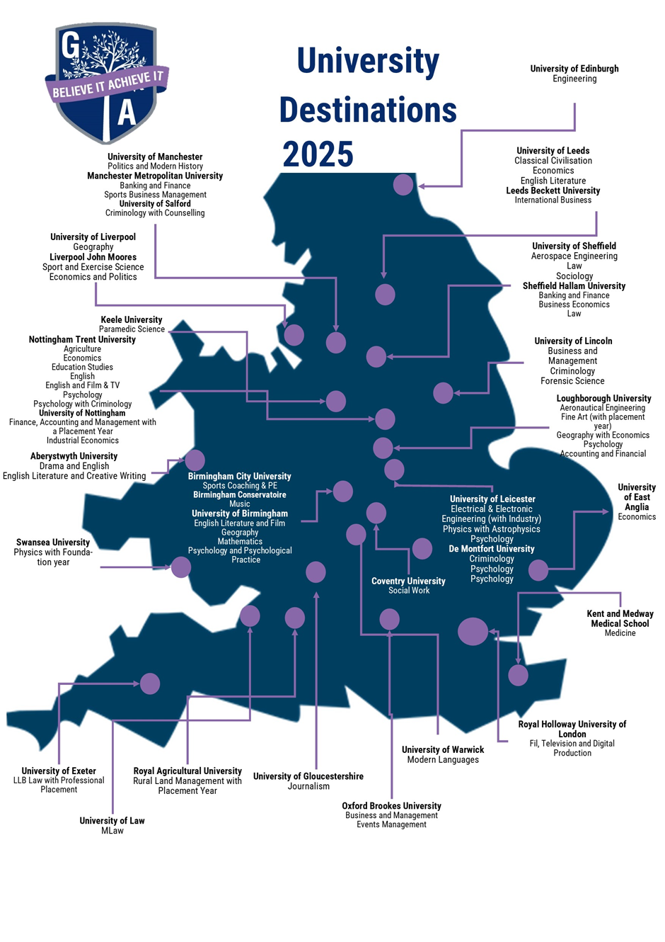 The universities and subjects which our students have taken up offers for in 2025 are shown on the map below: