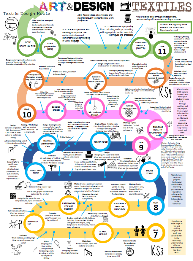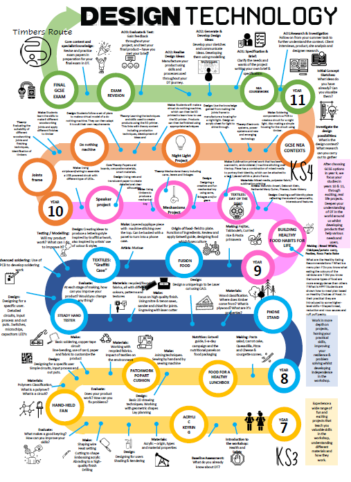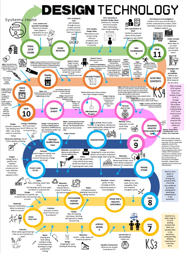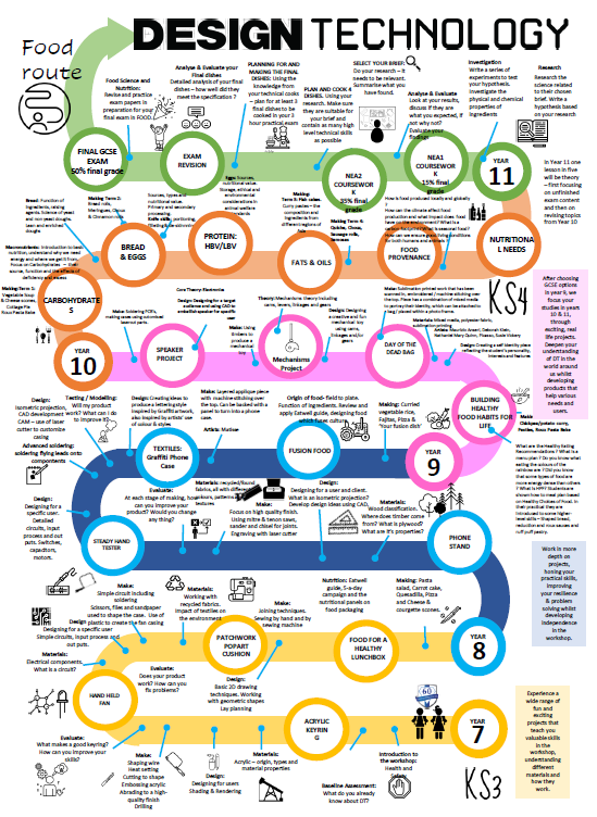 Our Design Technology curriculum journey shows how we develop the skills of our students and the topics the students cover in each year. Click on the learning journeys below to view our food,