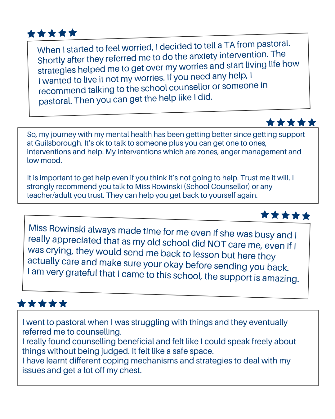 Here are some testimonies from students that have worked with Miss Rowinski, our qualified and dedicated School Counsellor.